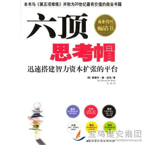 《六頂思考帽》是著名的英國創(chuàng)新思維家愛德華.德.博諾的作品,它通過六種不同顏色詮釋了六種不同的觀點(diǎn)。六頂分別是每個人都認(rèn)識:藍(lán)、白、紅、黃、黑、綠這六種不同的顏色,之所以叫思考帽,是形象地讓人更容易理解和接受,也能夠想象到自己戴上或摘下不同顏色帽子的感受。 藍(lán)帽:觀察和管理思考。藍(lán)帽負(fù)責(zé)控制各種思考帽的使用順序,它規(guī)劃和管理整個思考過程,并負(fù)責(zé)做出結(jié)論。